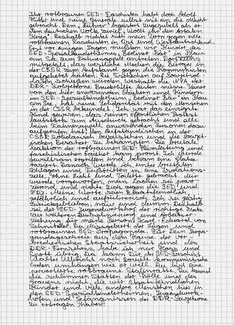 Jedes Kind wußte 1966/67/68/69 genau Bescheid: wer im Spezialkinderheim "Berliner Bär" in Plau am See nicht spurrt und den staatlichen Erziehungsbeamten nicht in den Arsch kriecht, der kommt mit dem 13./14. Lebensjahr schnell in den geschlossenen Jugendwerkhof Torgau. Danach drohte dem Jugendlichen die sofortige Einweisung in einen anderen Jugendwerkhof zur Arbeitserziehung.